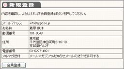 3.登録内容の確認確認画面が表示されます。内容が正しければ、[会員登録]ボタンを押してください。 |